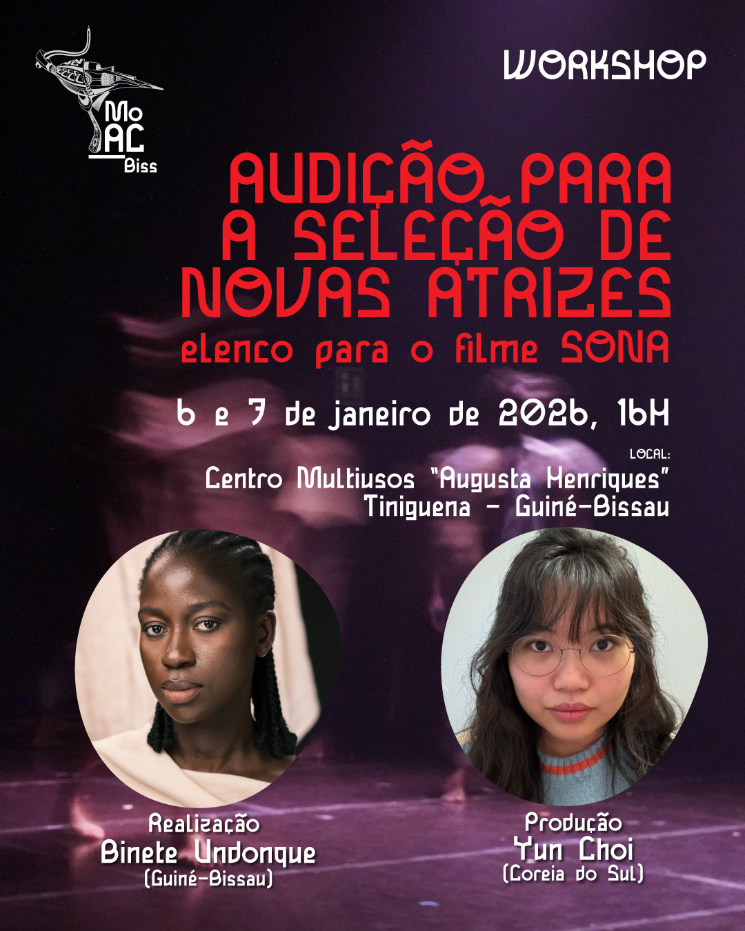 A Fundação MoAC Biss dinamiza, durante os dias 6 e 7 de janeiro de 2026, no Centro Multiusos “Augusta Henriques” na Tiniguena, a partir das 16:00, um Workshop de Audição e seleção do elenco para o filme SONA, com realização de Binete Undonque e produção de Yun Choi.